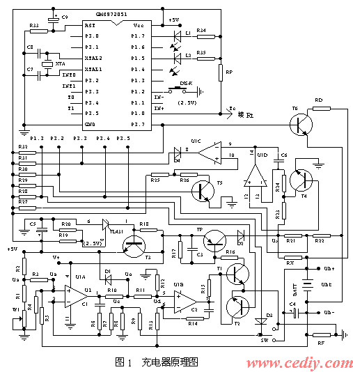 多功能充电器由基准电压源、恒压—恒流电路、电压检测电路、电池最高温度检测电路及放电电路等部分组成,电原理图如图1所示。